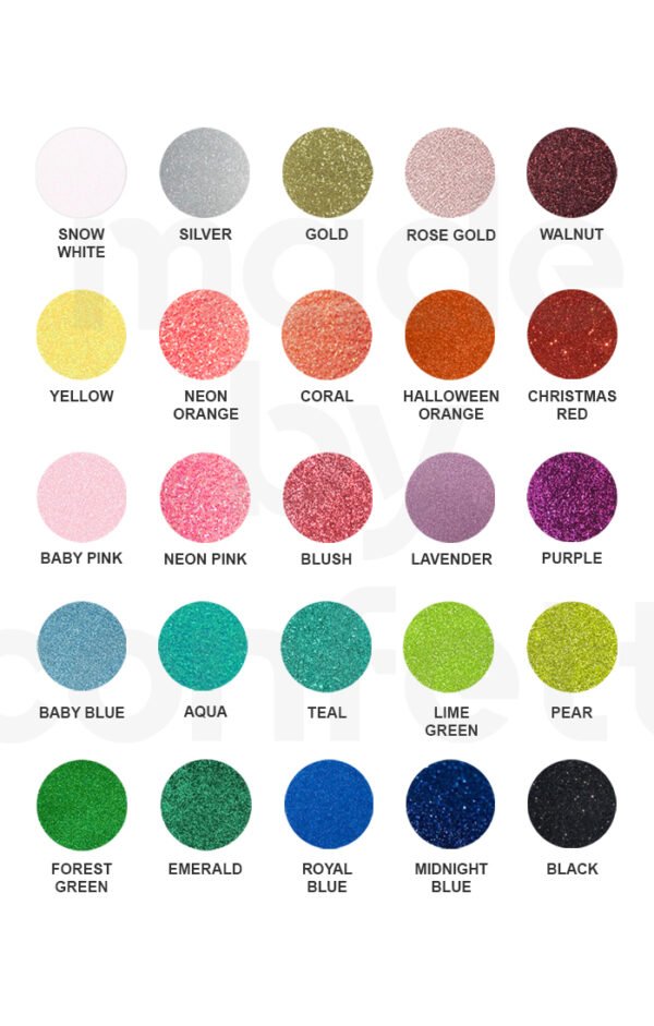 Aqua, Baby Blue, Baby Pink, Black, Blush, Christmas Red, Coral, Emerald Green, Forest Green, Gold, Halloween Orange, Lavender, Lime Green, Midnight Blue, Neon Orange, Neon Pink, Pear Green, Purple, Rose Gold, Royal Blue, Silver, Snow White, Teal, Walnut, Yellow