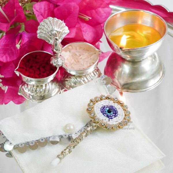 The Evil eye Tikka applicator is an essential tool in your rakhi plate-it helps keep a mess free tikka experience.Keeping buri nazar away!